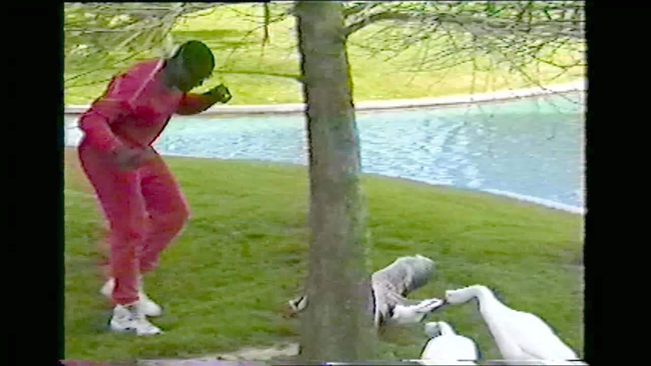 Man in red jogging suit is attacked by goose. Man runs away, trips, falls. Animal revenge. .