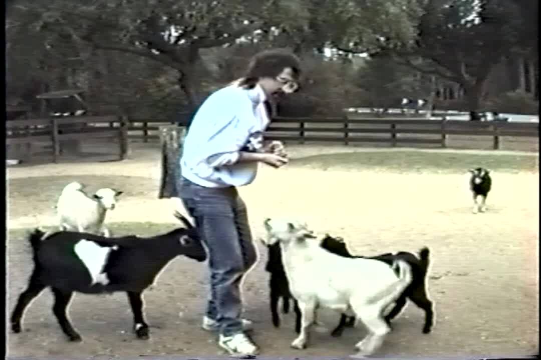 A goat jumps on a young girl while she makes a video about "goat camp" on a farm.