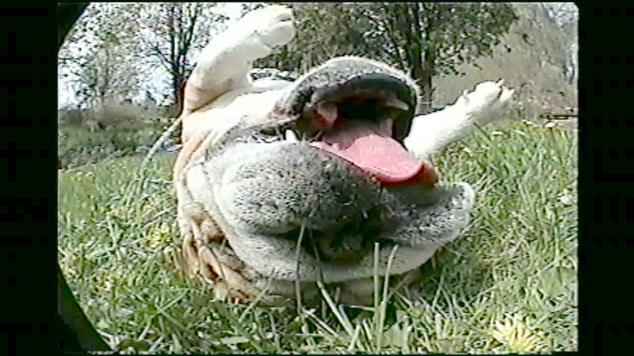 "Bulldog Day Afternoon" Stand Alone: Bulldog rolls around yard and makes disgusting noises, camera is close in on his mouth **ONE OF THE BEST DOG CLIPS EVER!!!** Upside down. fish eye lens. Bulldog Day Afternoon