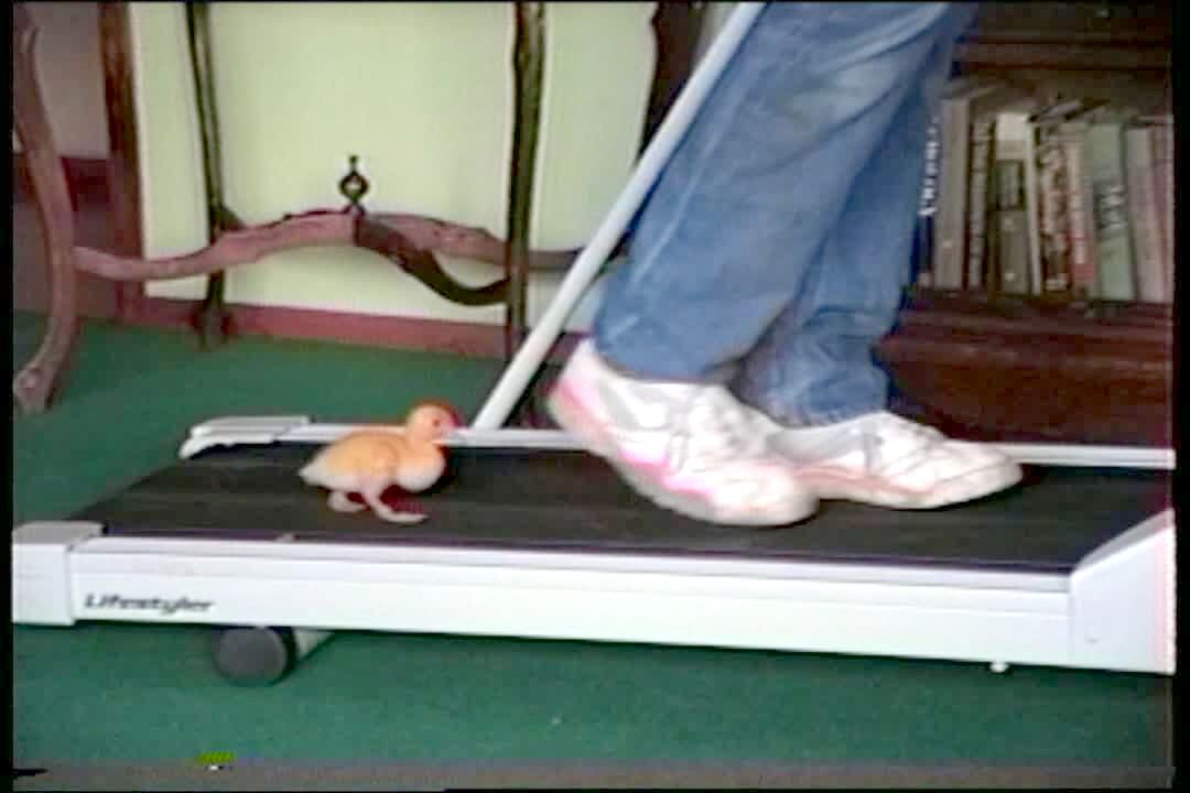 DUCK TREADMILL DUCK. Duckling joins boy on treadmill.