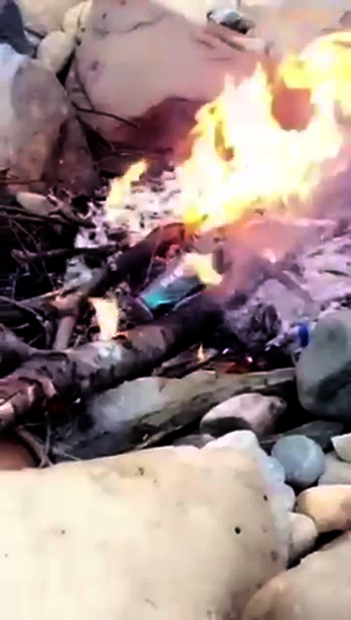 A group of teen boys outside throw a can of Axe body spray into a fire pit. It explodes.