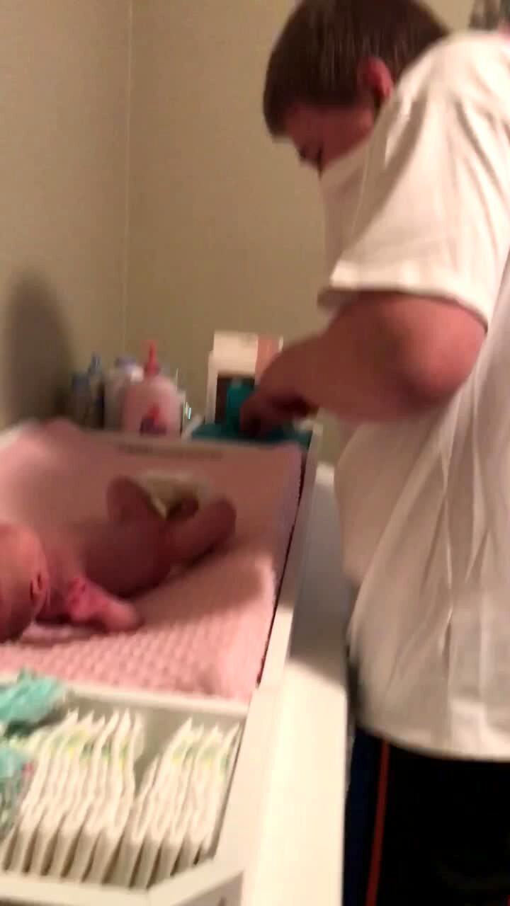 A man wretches and almost throws up as he cleans his baby girl's poop filled diaper.