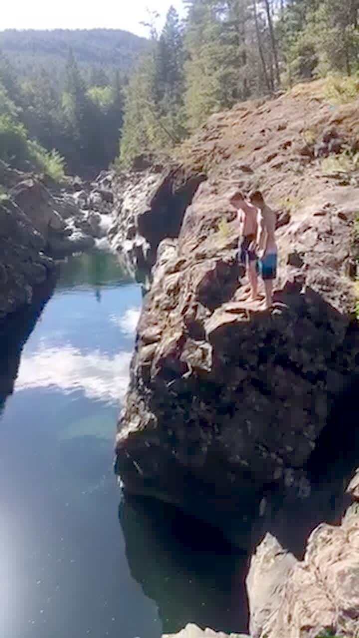 A teen boy slips on the side of a cliff face and falls in to a river below him when he loses his balance while he tries to jump off of the cliff after his teen brother.