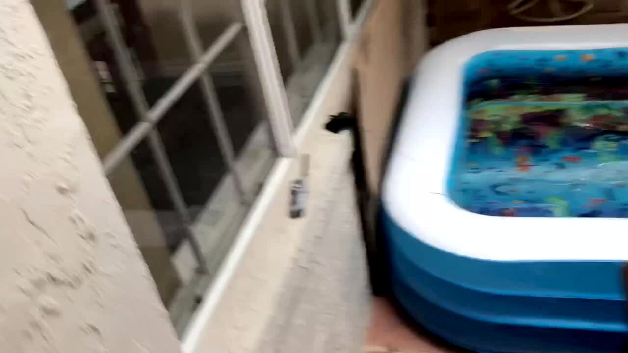 A man tries to heat the water in an inflatable kiddie pool with a blow torch. The pool pops and water spills everywhere.