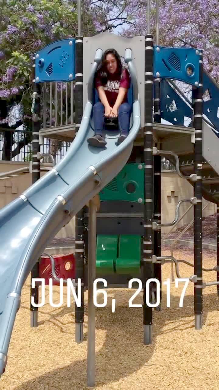 A teen girl hits her head when she falls on her back at a playground park after she goes down a slide while she sits on a skateboard. Snapchat banner: "Jun 6, 2017". Short tail.