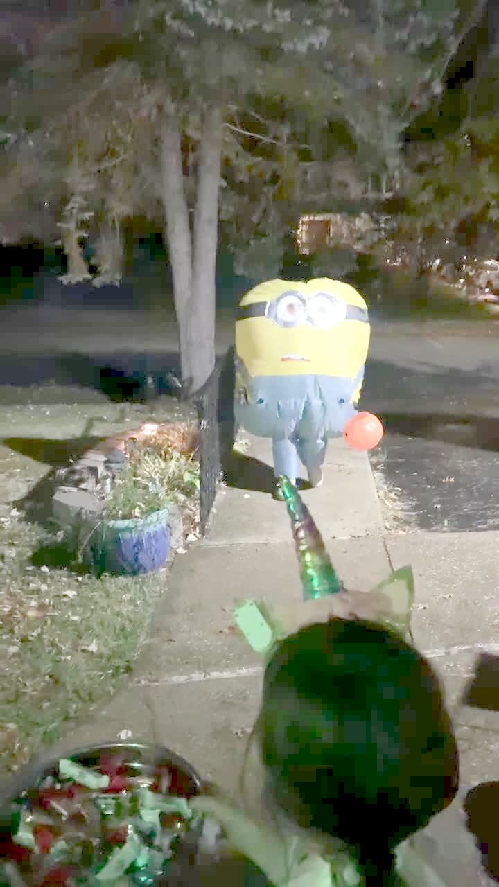 A young girl, dressed in an inflatable Minion costume trick or treats at a home, but as she digs the candy out, the tiny arm on the costume can't quite get her candy into her pumpkin basket. She spins and struggles on a sidewalk then stops and shrugs her shoulders.