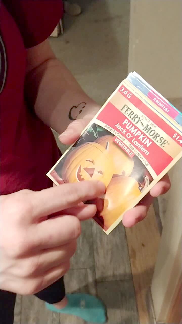 A man asks why a woman bought the "Jack O' Lantern" seeds? The woman points to the picture on the seed package and answers that those seeds will come with the Jack O' Lantern face, unlike other seeds that didn't come with the face. The man explains, "they aren't going to grow that way." The woman patiently insists that they will, and as proof points to the package label that says "Jack-O' Lantern." The man says, "oh, okay."