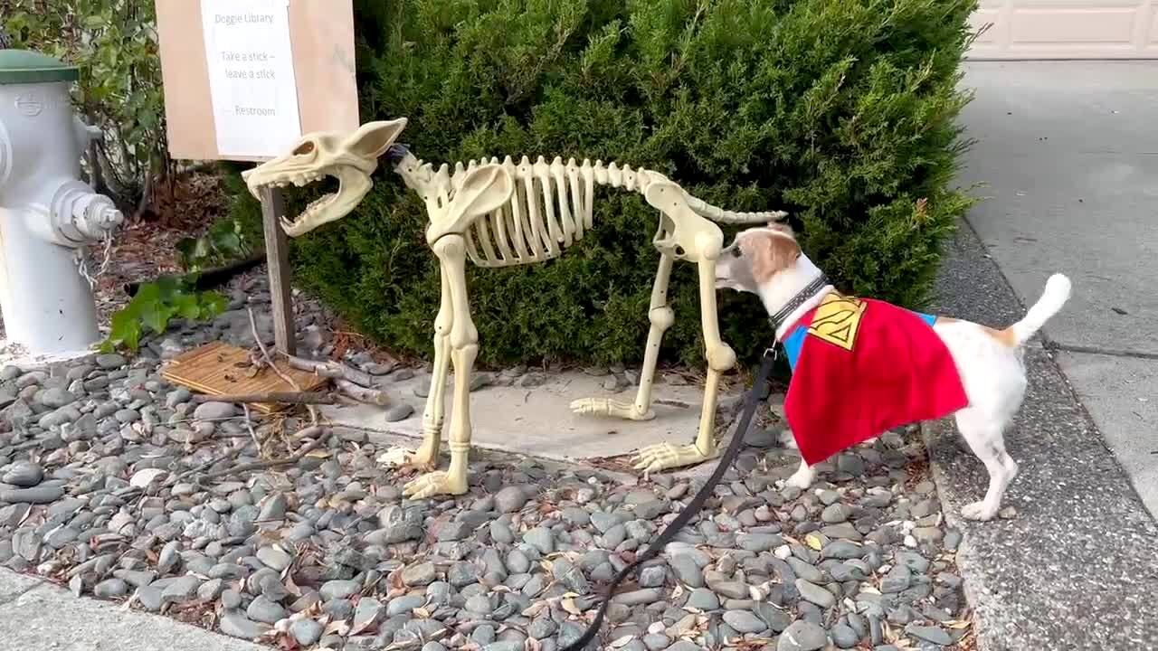 A dog in a superman costume sniffs and looks at a decoration skeleton dog in a driveway. The skeleton dog howls and the real dog barks at it. Halloween