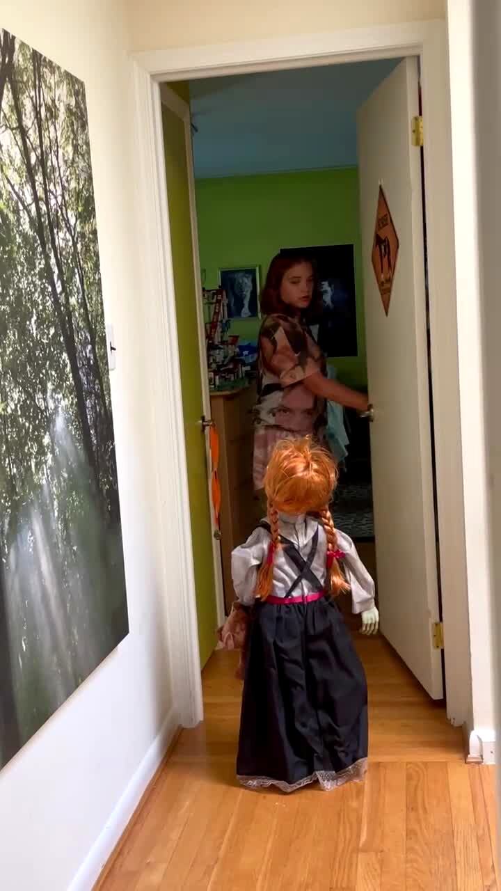 A teen girl comes out of her room and sees a creepy doll, then she kicks it down and walks into a kitchen.