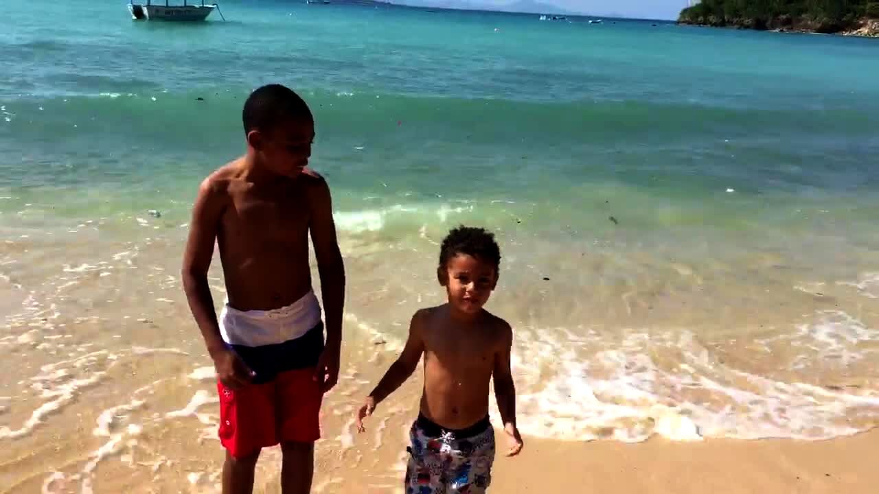 Two boys at the beach outdoors ask Alfonso to play sports clips.
