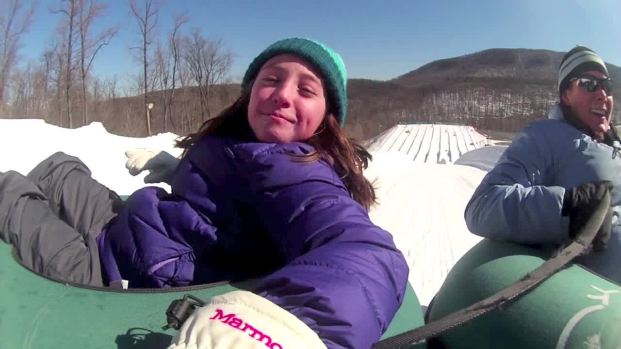 A girl rides a sled down a hill with a GoPro outdoors and turns to the camera to introduce Tom Bergeron.
