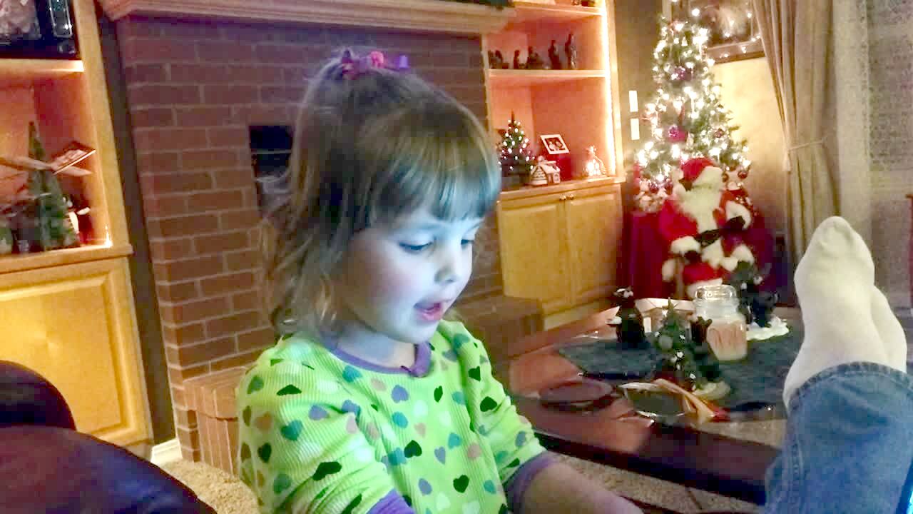 A young girl types thank you notes into a computer indoors and reads it aloud to her dad before he films the compute screen to show that she's only writing gibberish.