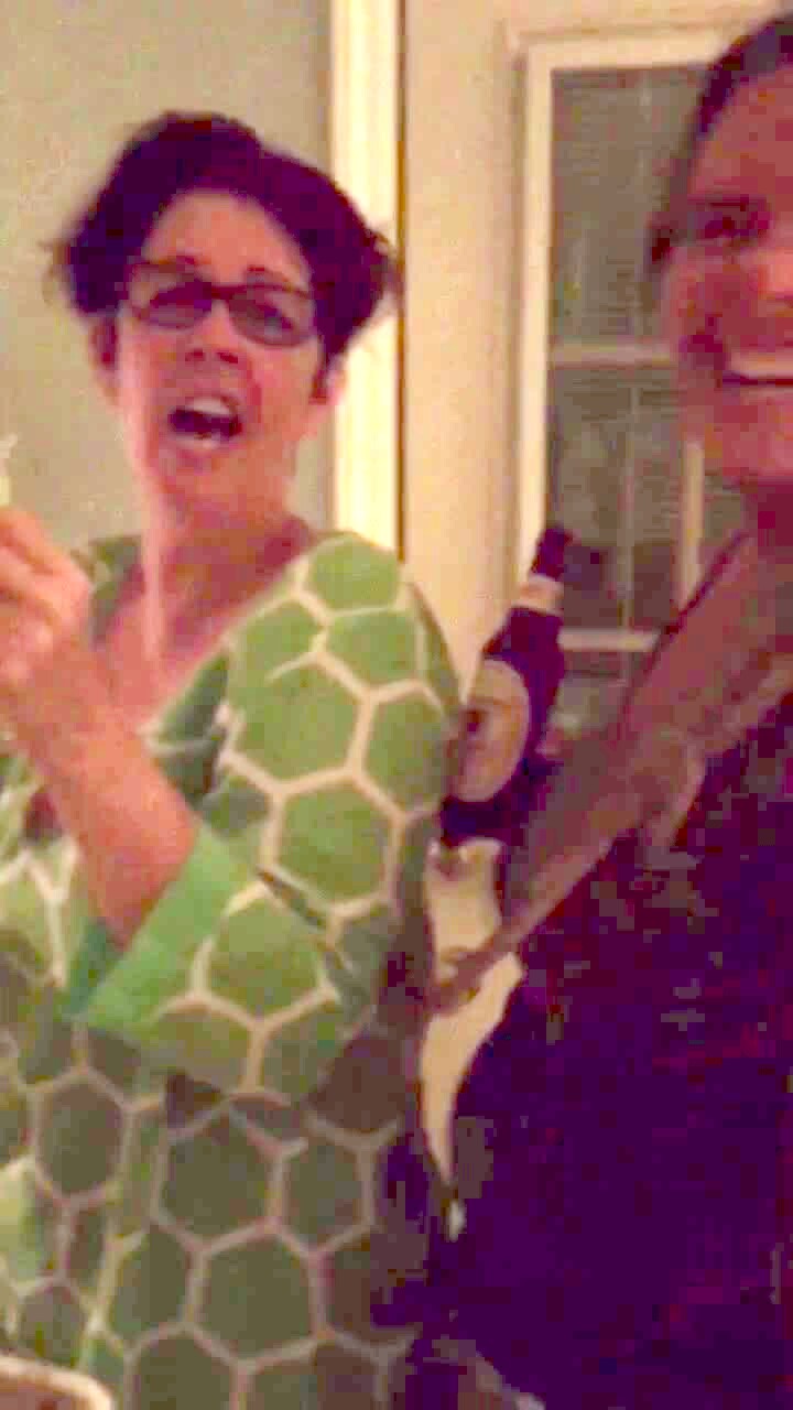 A woman walks around with a lizard reptile on her shoulder. She taps on another woman's shoulder to show her, then the other woman screams indoors.