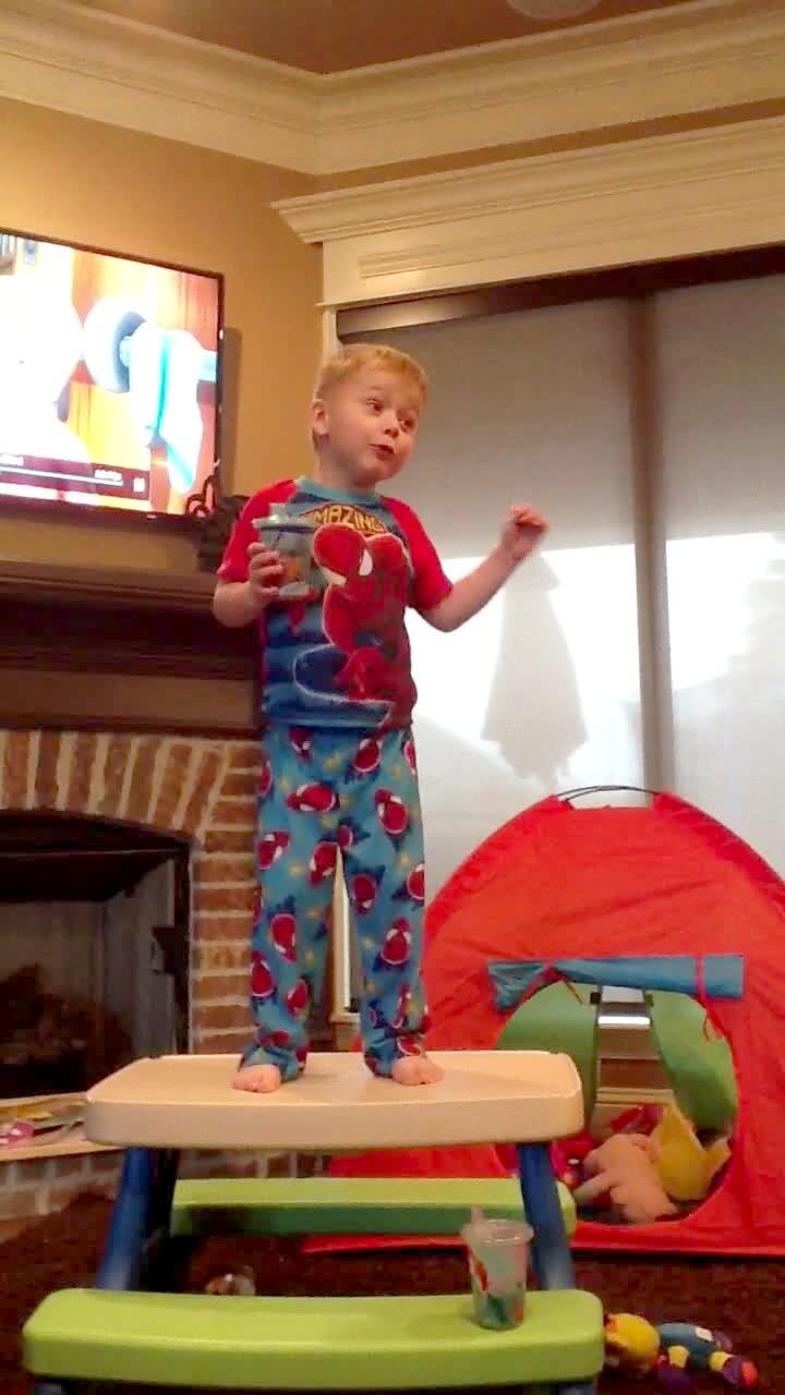 A tot boy standing on a toy picnic table introduces Tom Bergeron at home.