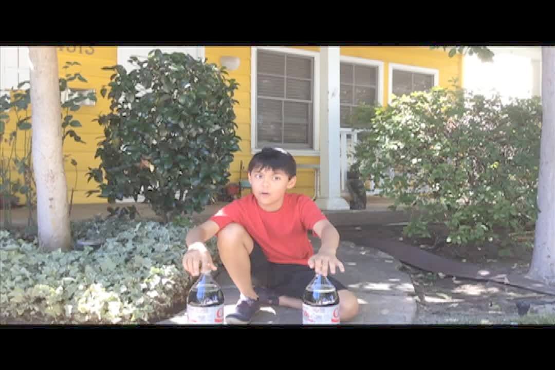 A boy asks Alfonso to see more slow motion videos before he drops Mentos into bottles of coke and they explode in slow motion outdoors.