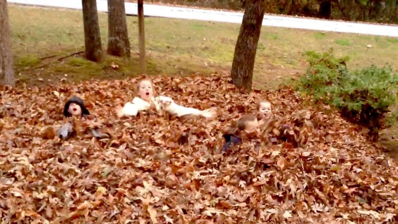 Two girls and two boys jump out of a pile of leaves outdoors and introduce "Tom Bergeron!" together.