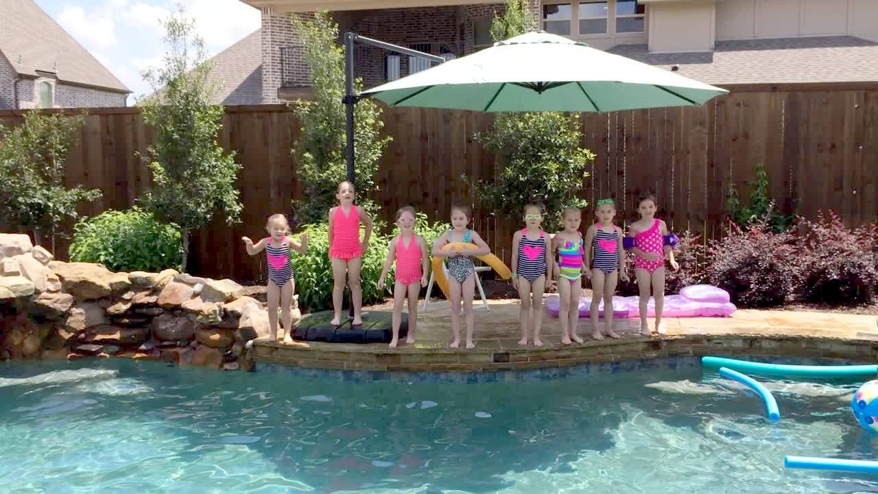 Eight young girls in swimsuits shout "Tom Bergeron!" then jump into a swimming pool outdoors. Introductions.