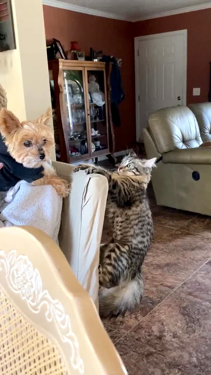 A cat in the living room sits on the backrest of a chair and sniffs a dog. The cat slowly backs away and climbs down the chair as a woman brings the dog closer to the cat.