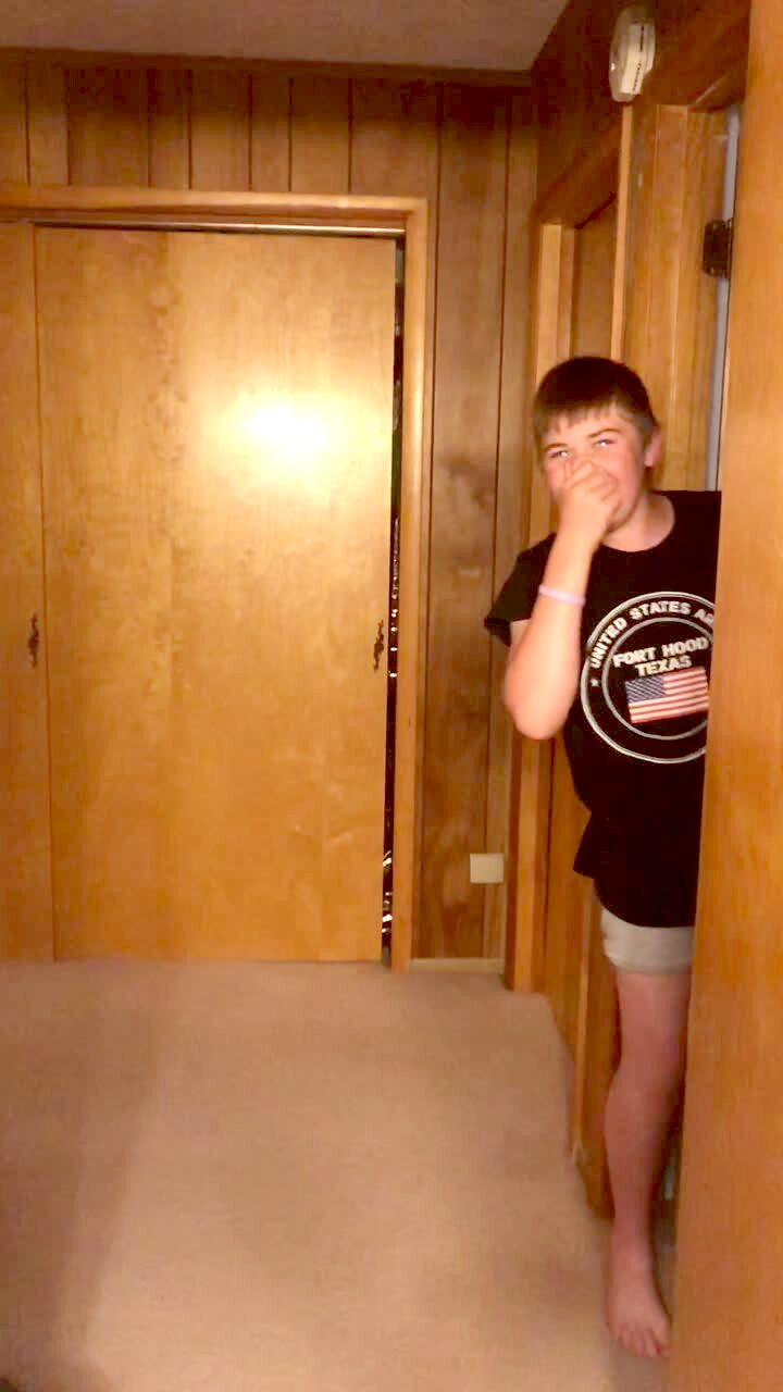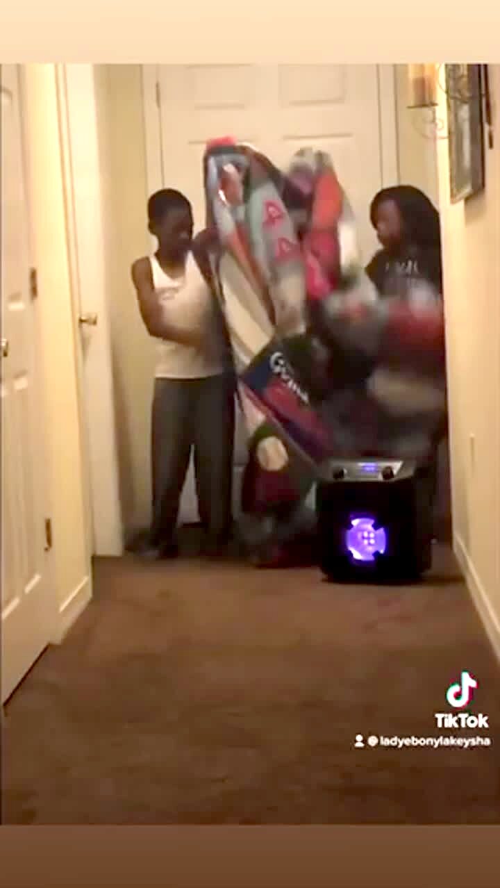 Two young boys and a young girl attempt the disappearing human trick in a hallway. One young boy hits the wall as the blanket falls. TikTok Social Media Video.