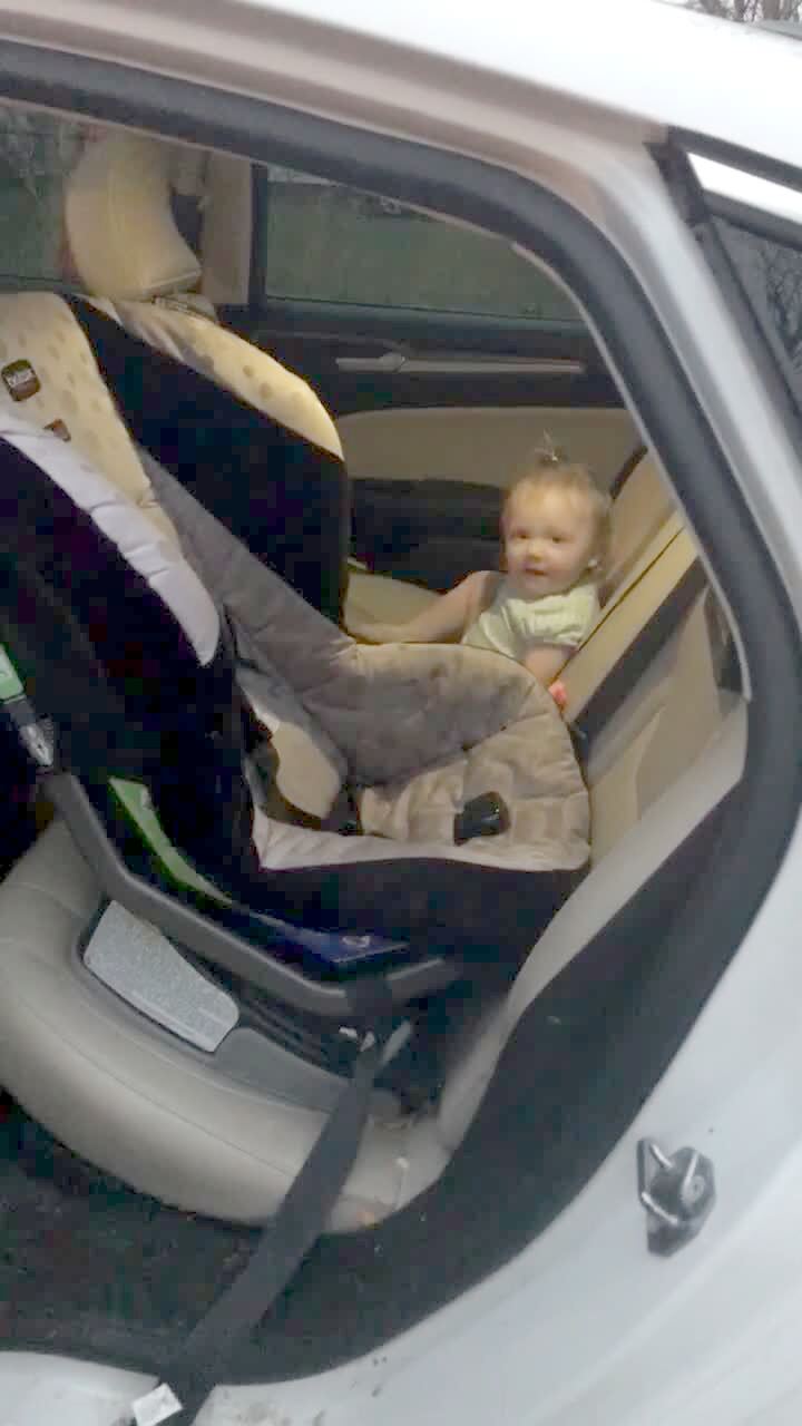 A baby girl sits in the back of an automobile and the door shuts and the camera moves to the other side of the vehicle and the door is opened and the baby is now on the other side of the car.