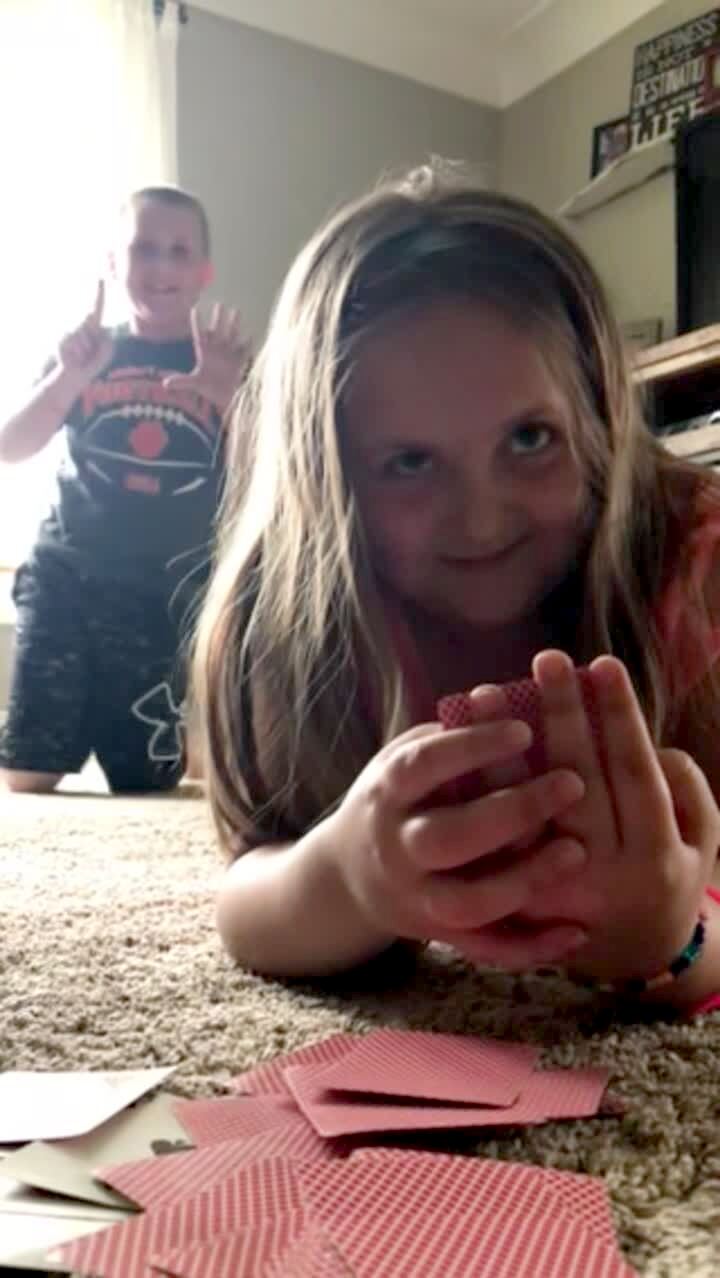 A young girl does a magic trick in a living room in which she holds up cards and her father guesses them. He always guesses correctly, because her younger boy brother holds up his hands to share the number behind her back. The young girl yells "how do you do that?"