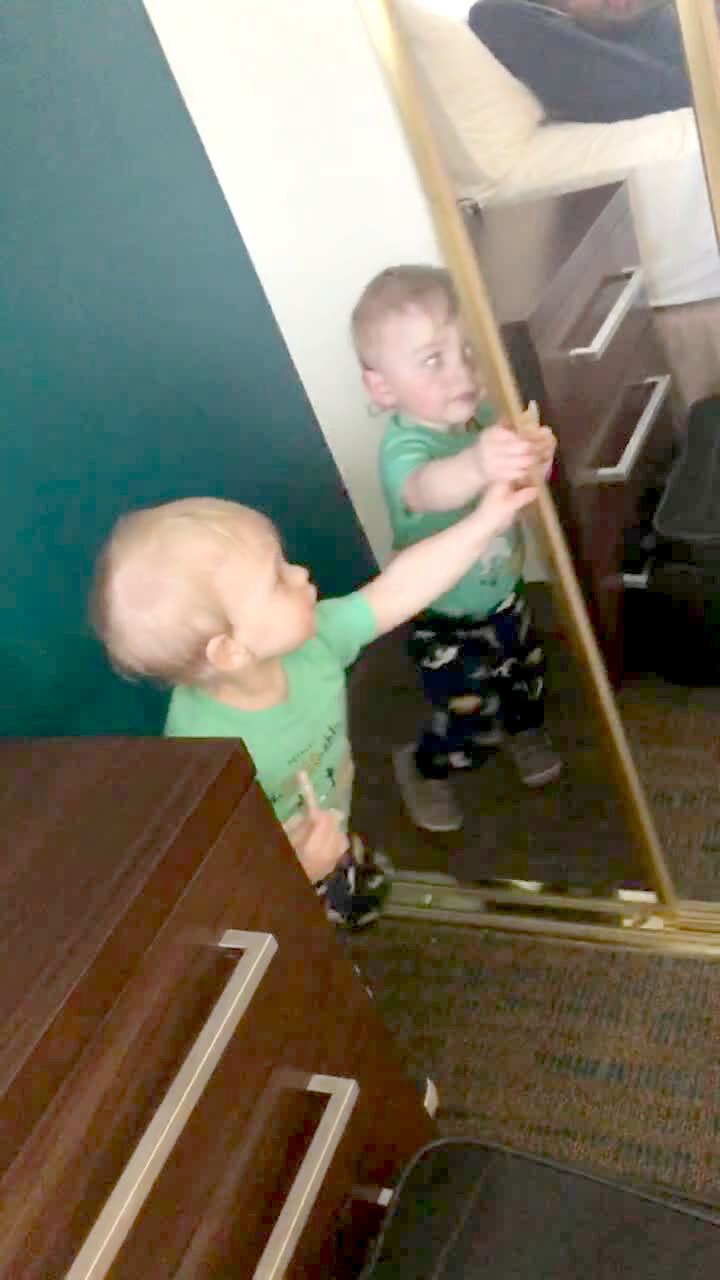 A young boy looks at his reflection in a mirrored door. Then his twin brother opens the door from the other side and lets him into the closet.