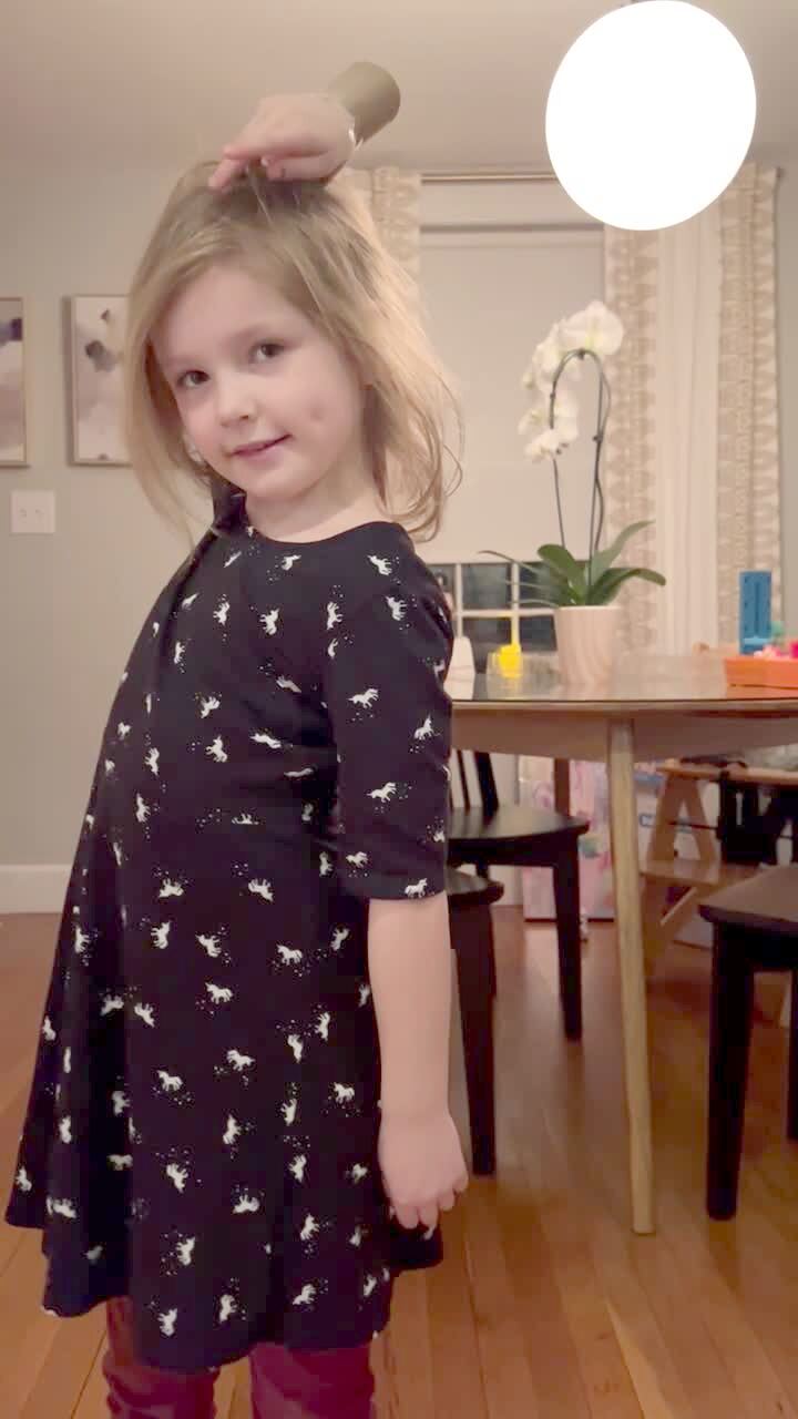 A young girl reaches her arm around behind her and scratches her head and there is a toilet paper tube taped to her wrist that makes it look like a dismembered hand in the dining-room.