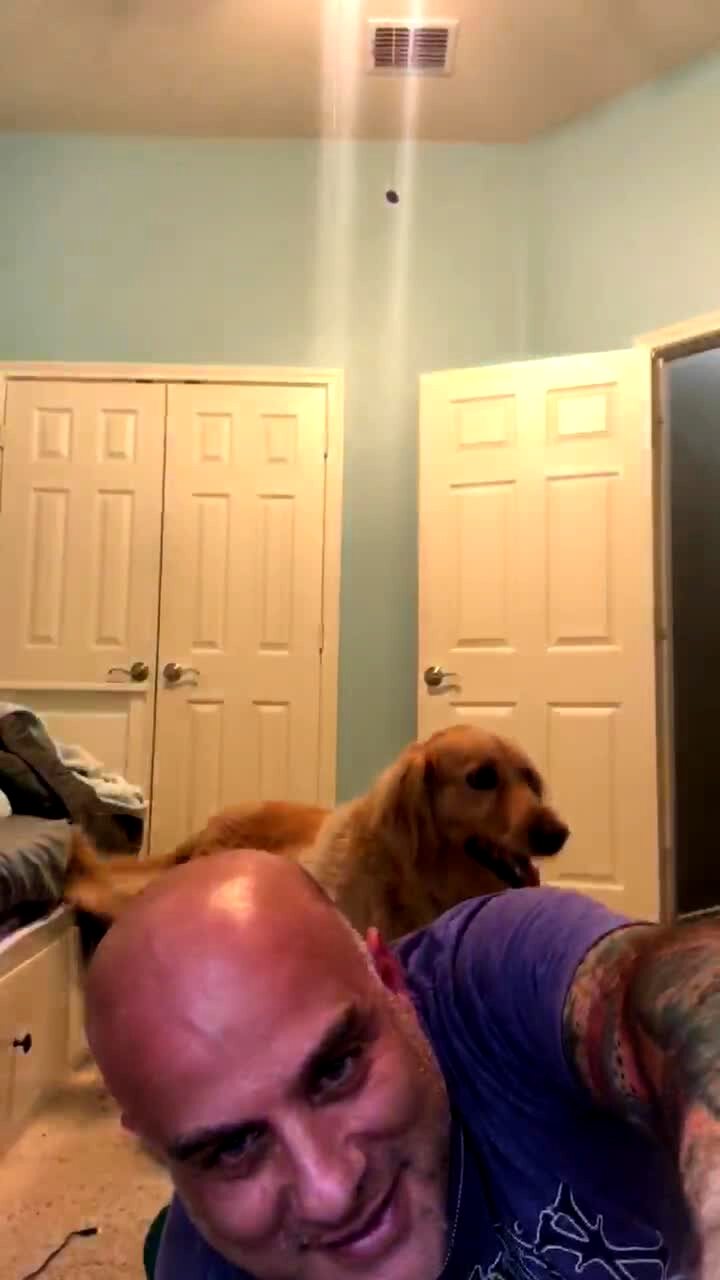 A man does the "Disappearing Human Trick" in front of his golden retriever, but he hits his head on the wooden base of the bed, and his dog comes over to check on him.