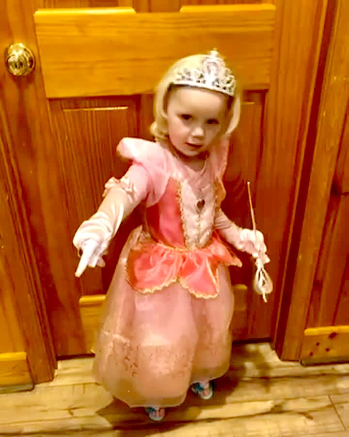 A young girl dressed in princess dress goes to throw her wand and it lands back into her other hand.