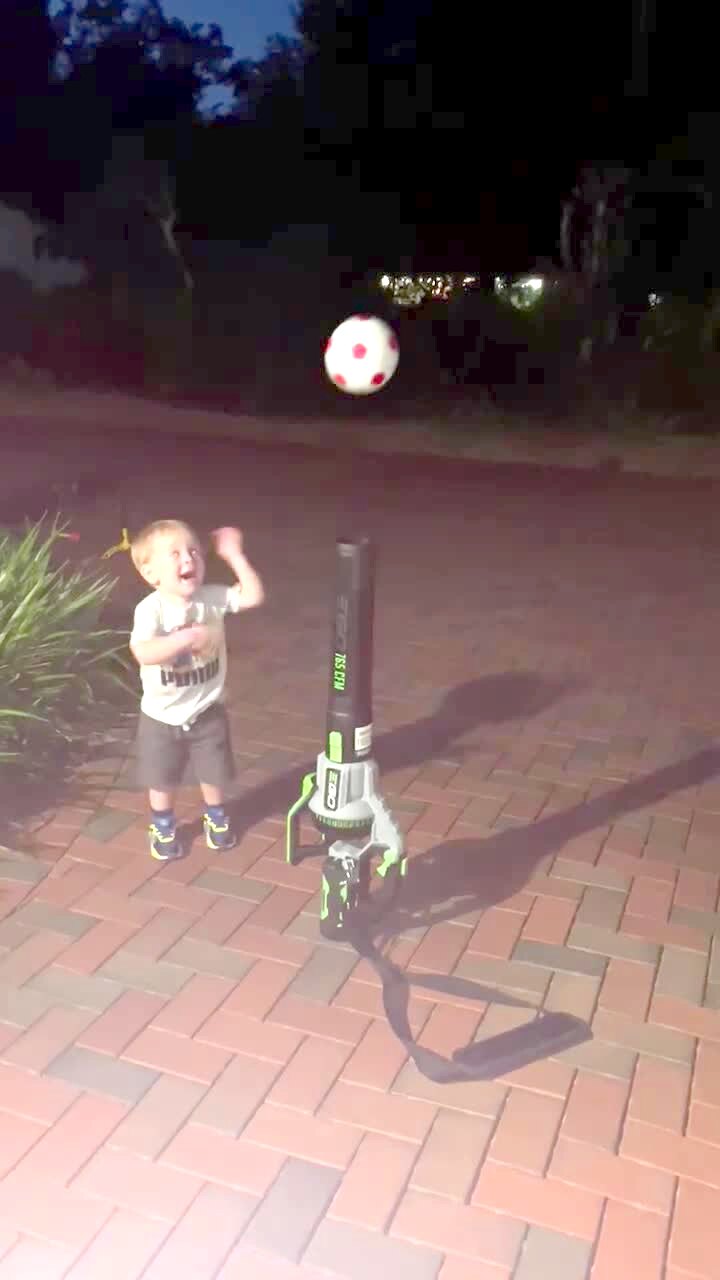 A young boy places a small soccer ball on top of a leaf blower in a yard and his father turns it on. The ball levitates above the leaf blower and the boy begins to scream and jump around as his brother appears and screams and jumps with him.
