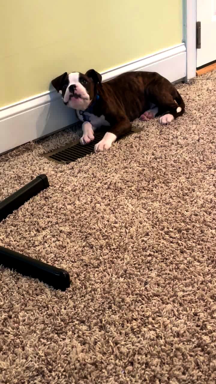 A Boxer puppy sits on a heating vent in the living room and barks at it. A woman tells him he can move and the dog gets vocal with her as though it were confused and irritated by the warm blowing air.