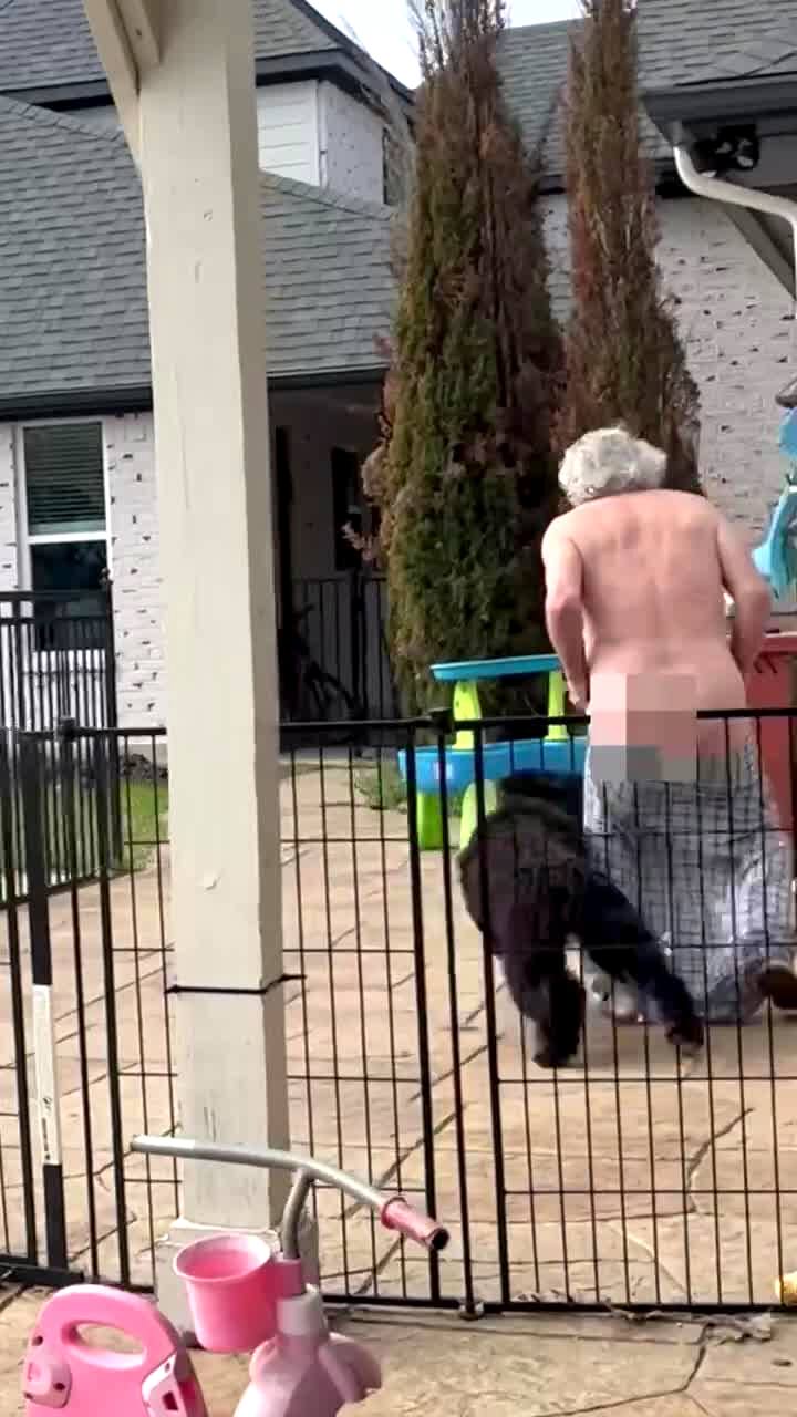 A senior man runs across his patio with just a towel on. He tries to avoid his excited dog but the dog pulls his towel off as the man runs into the house.