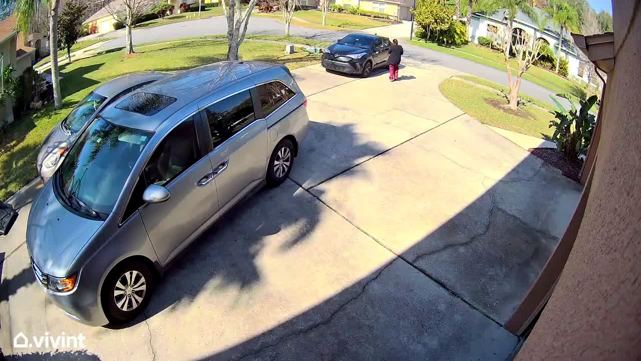 A woman walks to her car. Another woman comes out of the garage with a bunch of dogs that run and bark. The woman falls as she tries to hold a dog and her pants fall down. Security camera