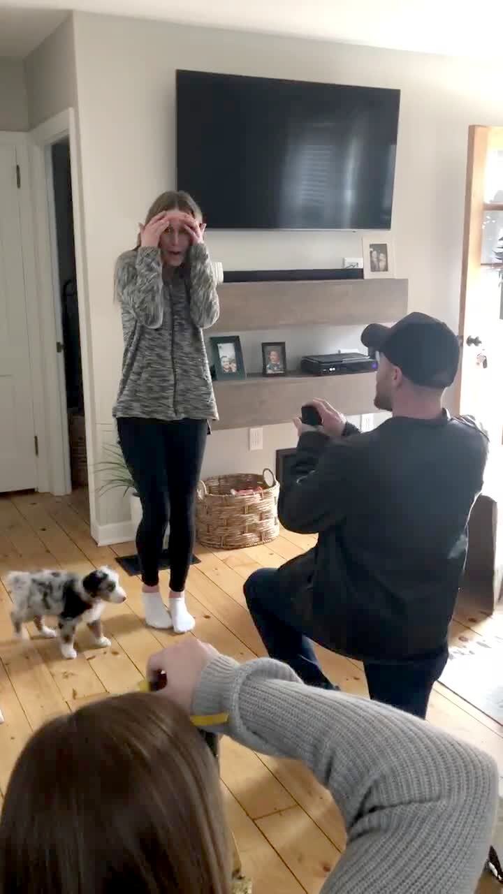 "Puppy Proposal Pooper" A man proposes to a woman in the house, and their puppy dog poops on the carpet behind them.
