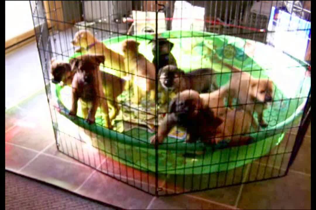 Puppies sleep in their cage. The all wake up and hop up when woman says "Good morning" to them. They run out to see woman.