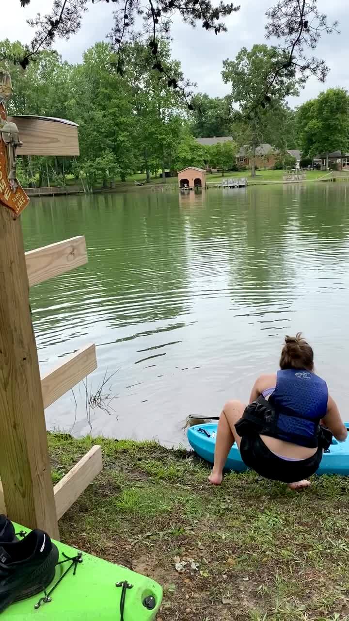 A teen girl tries to get into a kayak and her teen brother rows over to help her and she tries to climb into his kayak as she falls and they both fall in the lake.
