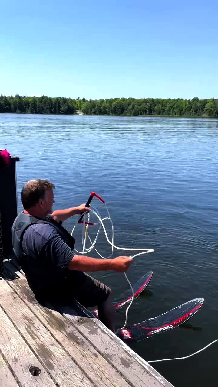A man yells "go ahead" repeatedly while he sits on a dock with water skis and holds a rope by a lake. A boat pulls him forward, and he immediately falls face-first into the water.