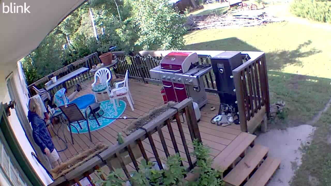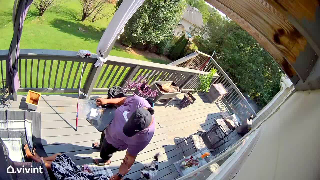 A man walks out onto a patio deck to put a cover on a kiddie pool when he trips over a chair and falls down into the water. Security footage.