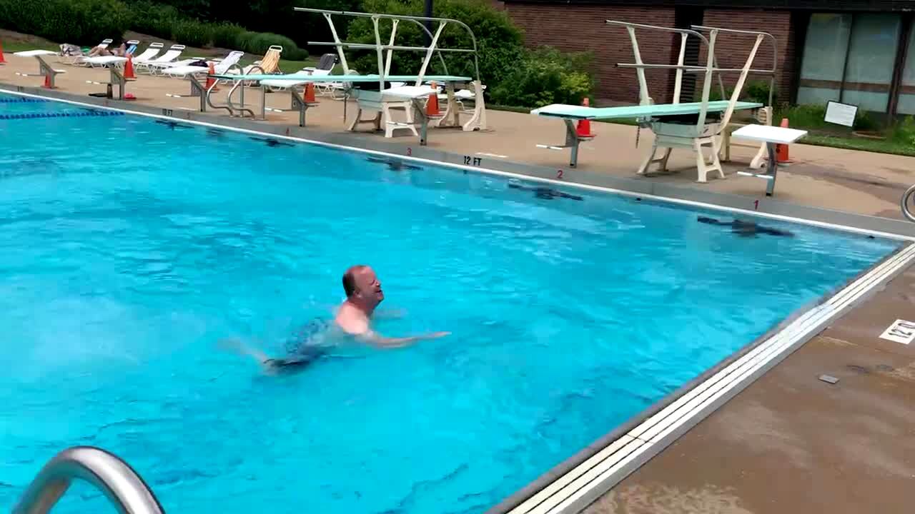 A man tries to do a flip off a diving-board but he lands on his back at a public pool. Featured talent cleared (no release for the second boy who uses the diving board).