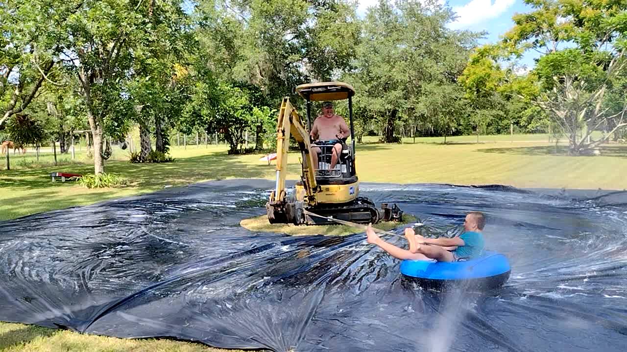 A young boy sits on an inflatable tube and holds onto a rope that is connected to heavy construction machinery. A man operating it spins the boy in circles on a wet tarp.