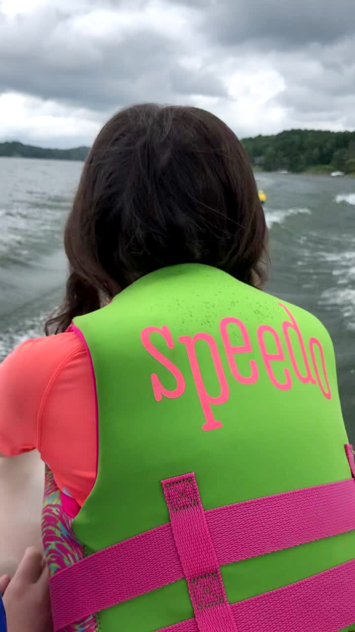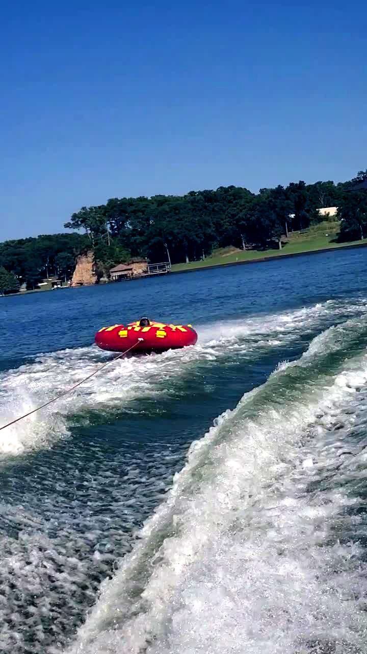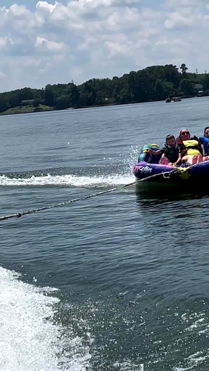 A father rides in an inflatable tube tied to a boat, but it flips him over into a lake, and his kids cry and scream.
