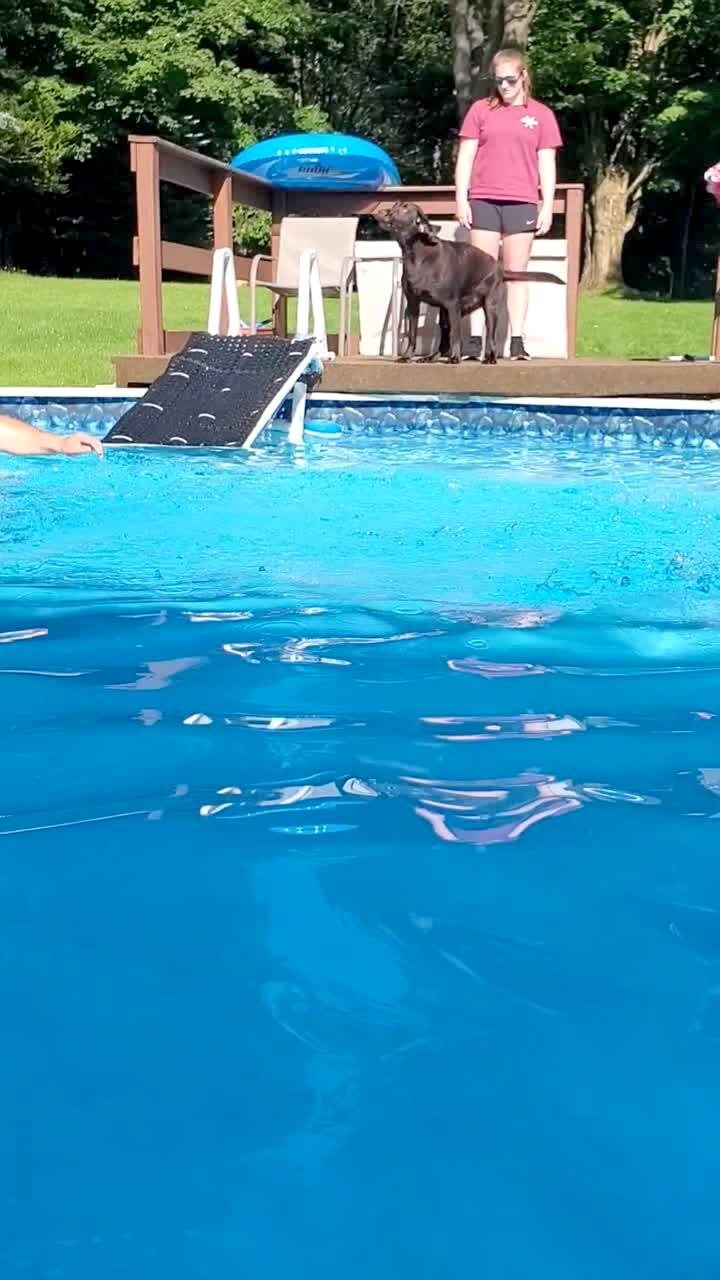 A man swims in a pool and calls a dog into the water. The dog stands on the edge of the pool and barks at him. Eventually, it jumps into the pool and crashes into the man.