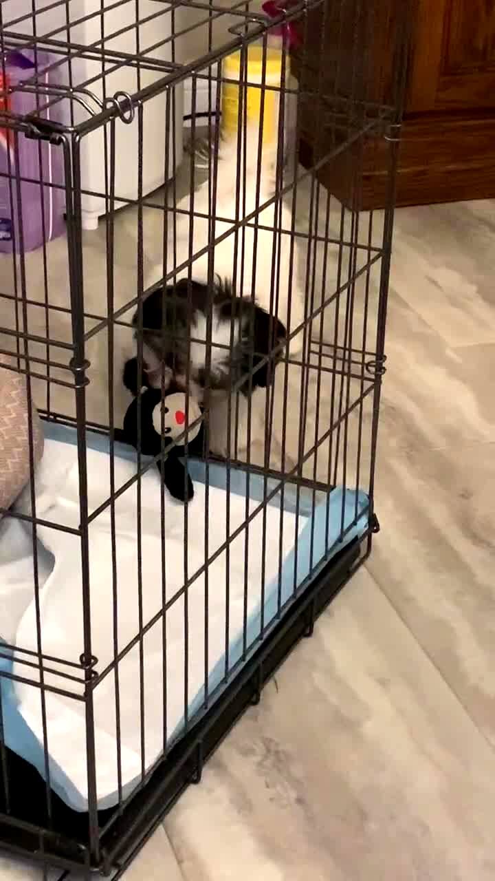 A dog takes a long time to pull a toy out of a crate. After it successfully extracts the toy, it proceeds to walk back into the crate through the open door.