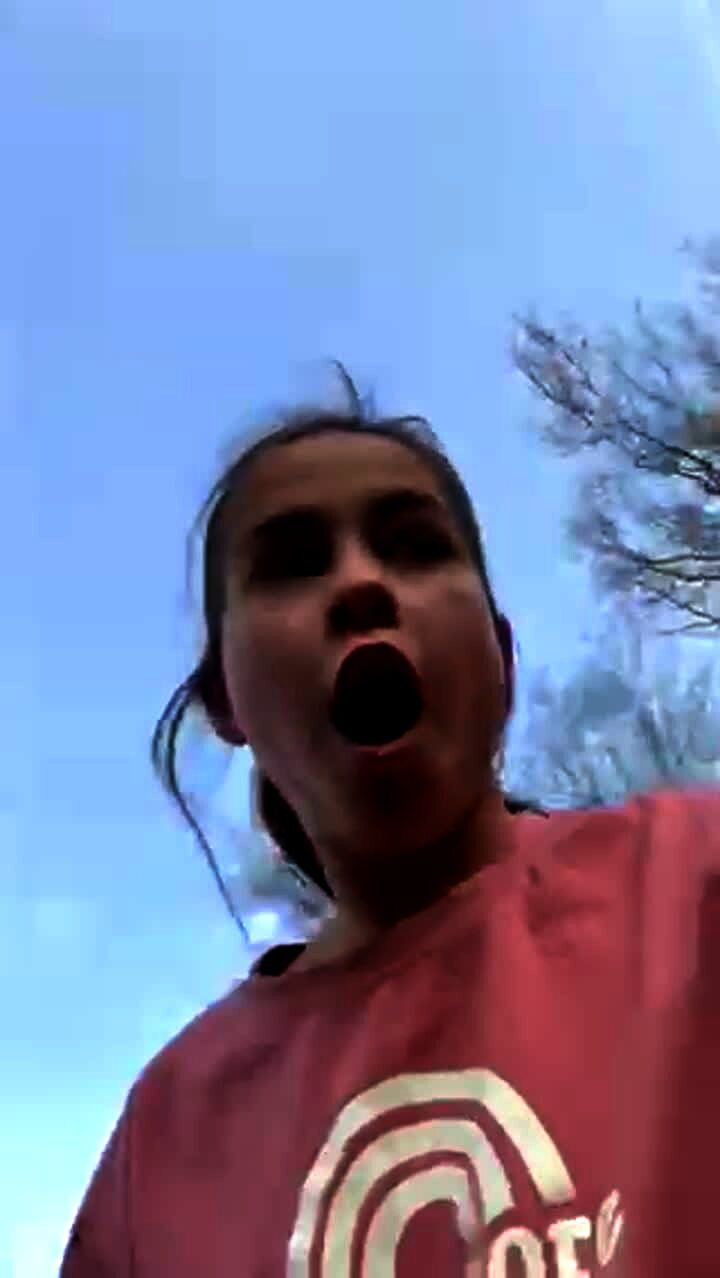 A goat jumps on a young girl while she makes a video about "goat camp" on a farm.