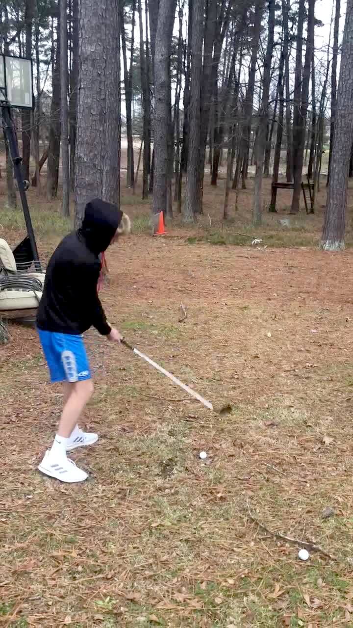 A teen boy's golf ball comes back to hit him after a swing at the golf course.