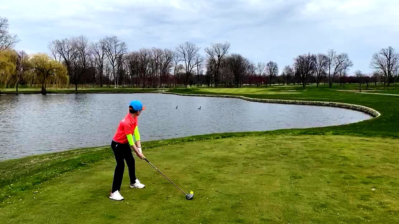 A young boy hits a golf ball, it bounces off a lake and a retaining wall around it, then flies through the air and lands back in front of him at a golf course.