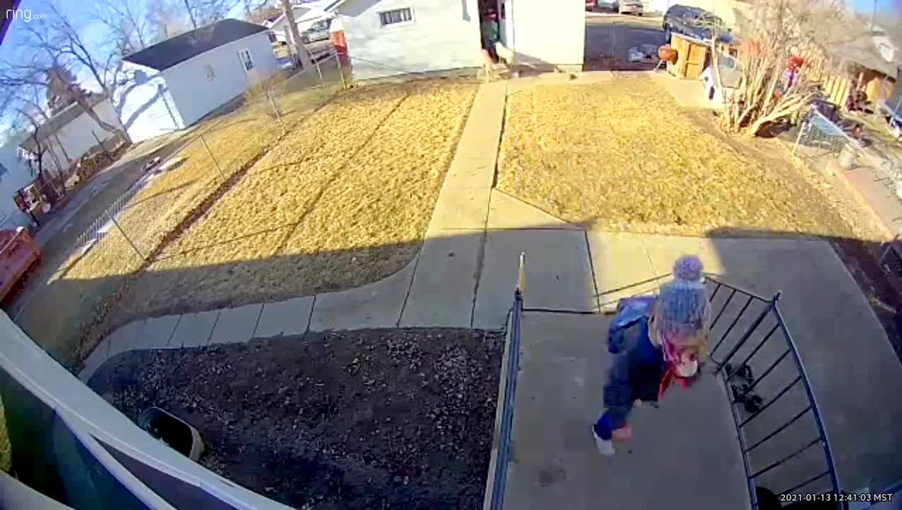 A screen door opens suddenly in a young girl's face and she falls down a porch staircase in a front yard. Security camera footage.