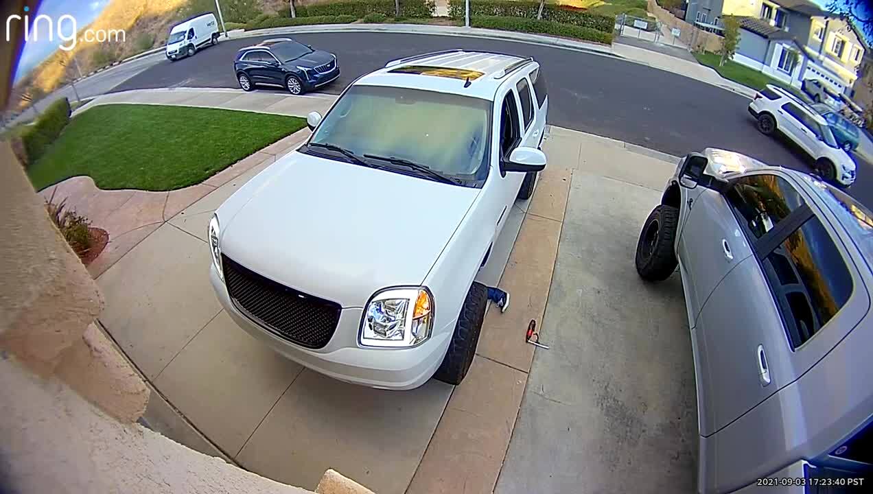 A man works underneath a car, then it rolls backwards over him. Security camera footage.