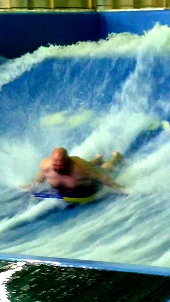 A man rides a boogie board on a surf simulator outdoors. He tries to stand up on it and wipes out, then slips and falls while trying to walk off. Featured talent cleared only (the bald man who wipes out).