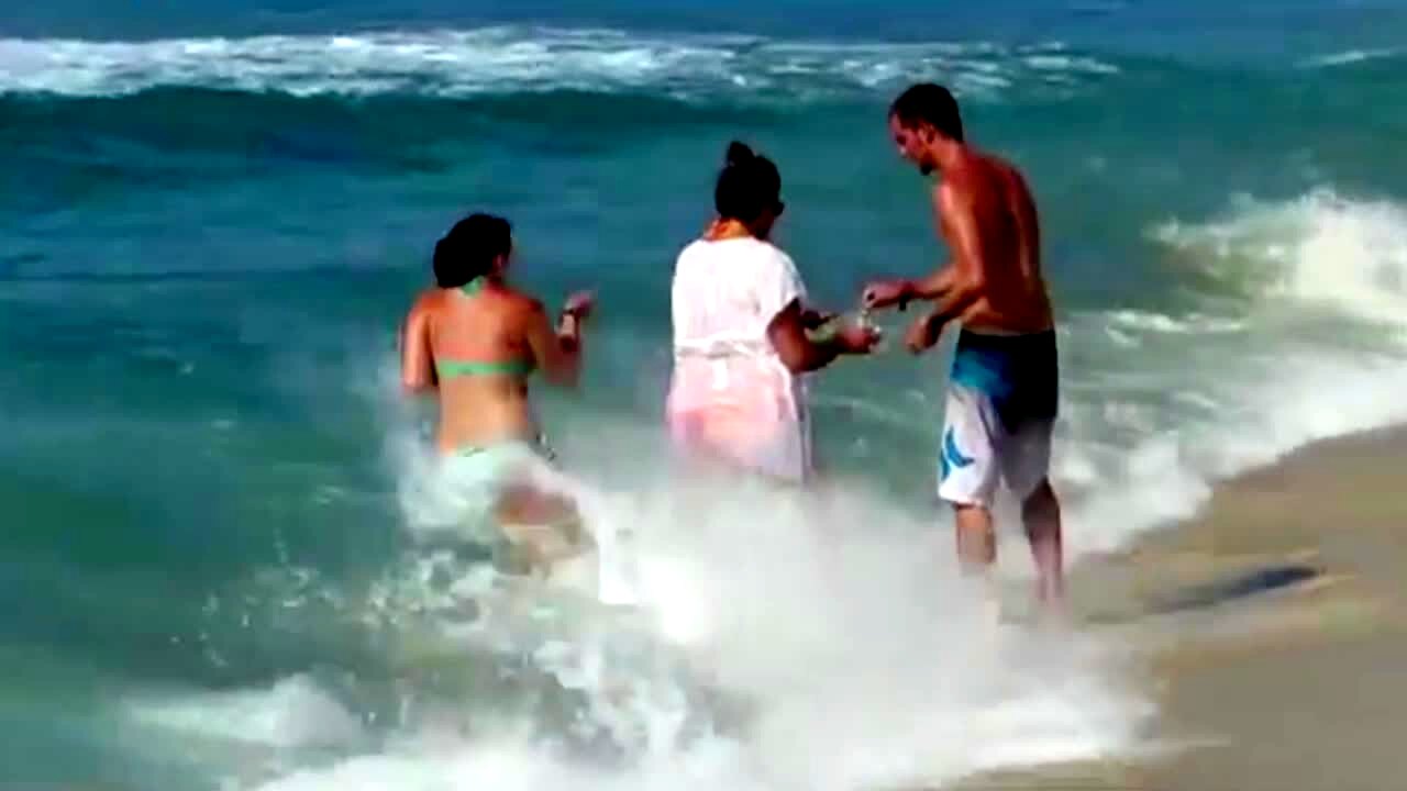 Woman and cameraman on cliff are whacked by beach wave; hit